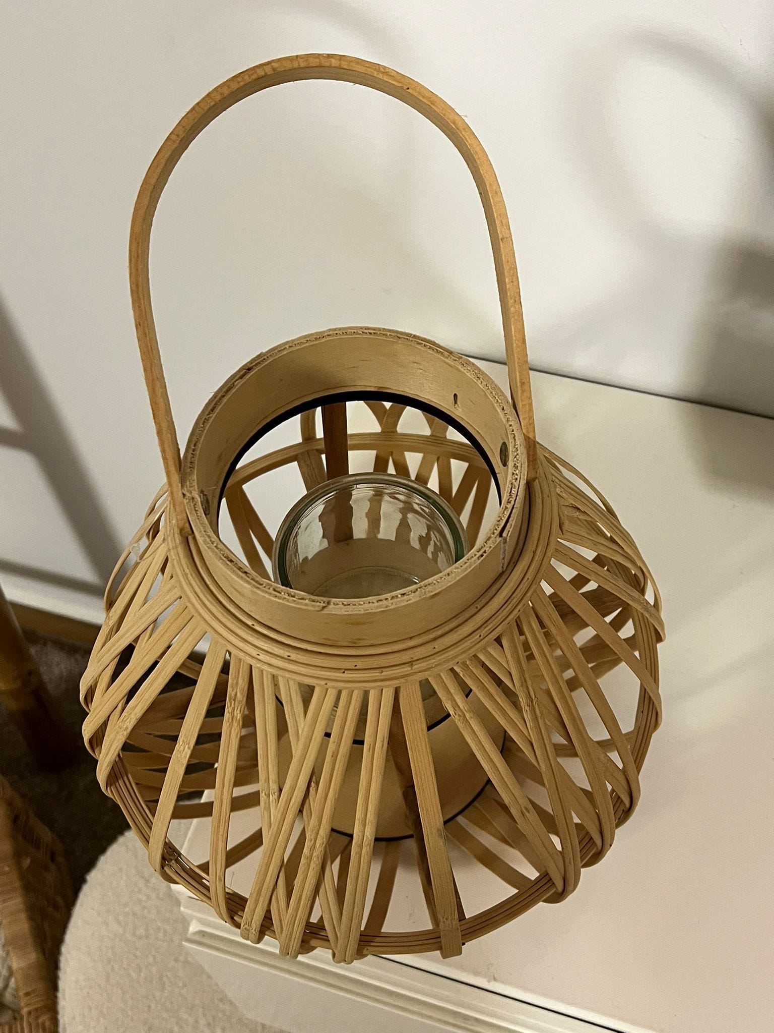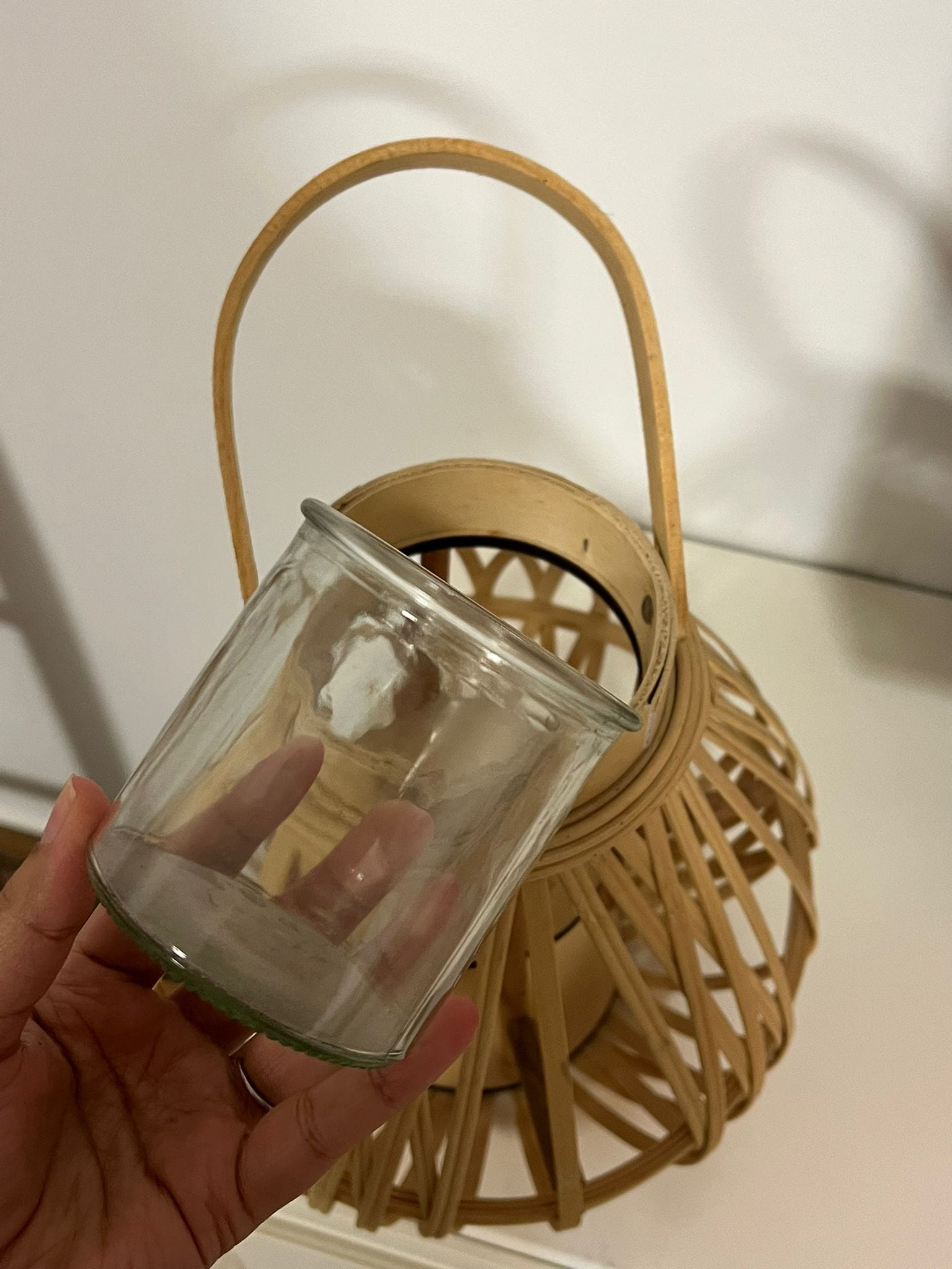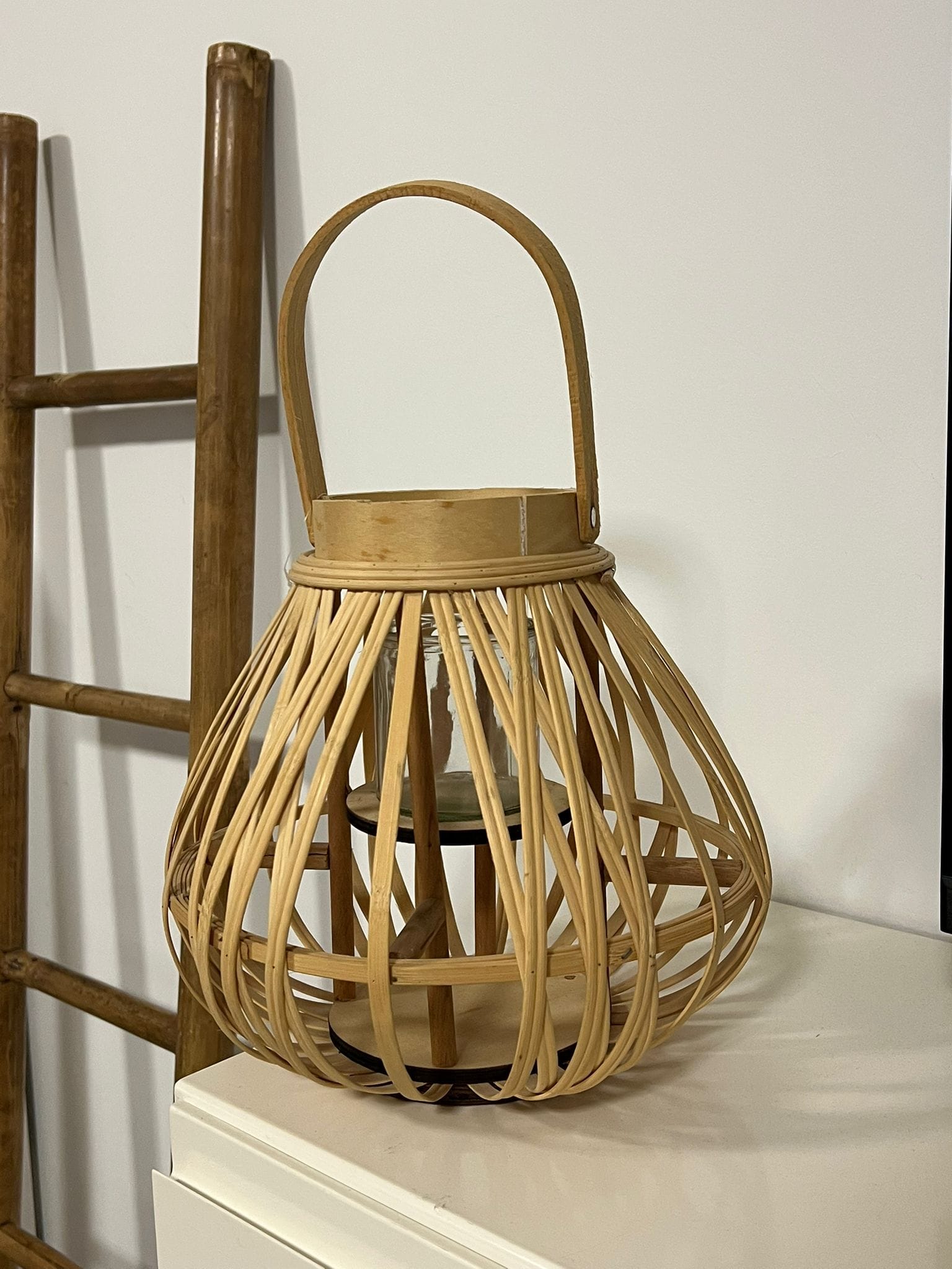 فانوس من خشب البامبو بداخله زجاجة لوضع الشمع يعكس اضائة مميزة