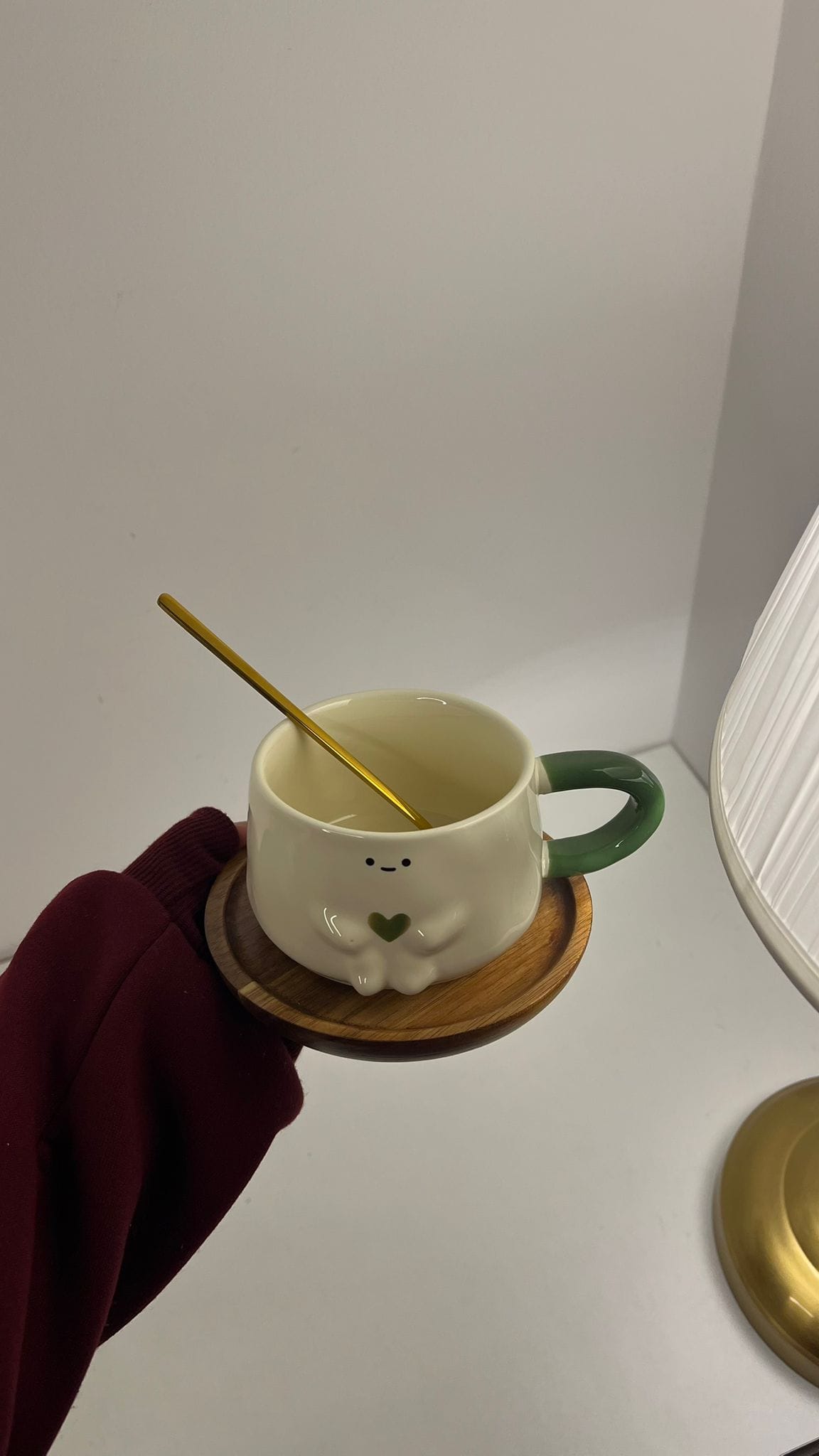 كوب سيراميك مميز مع صحن خشب ومعلقة ذهبية